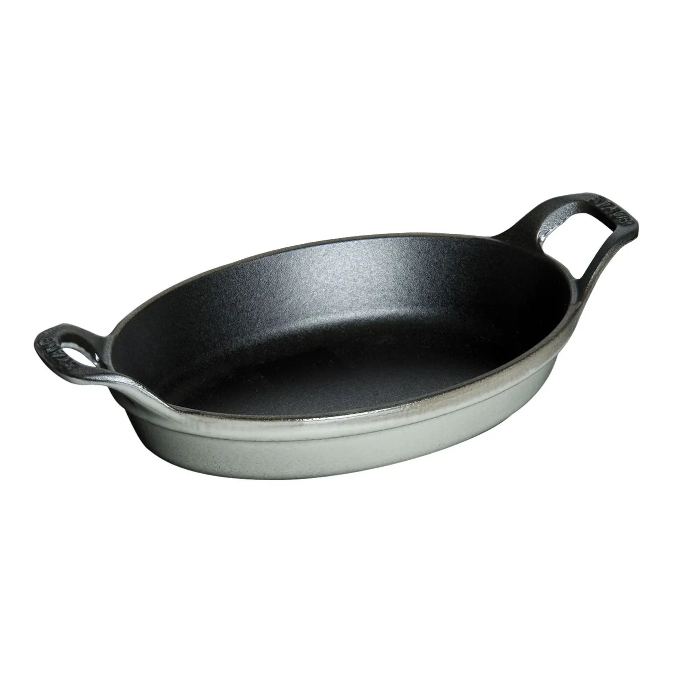Potrete preparare piatti di successo al forno, al gratin e con una gustosa crosta in questa mini casseruola ovale Staub di colore grigio grafite. La casseruola trattiene il calore in modo eccellente e lo distribuisce uniformemente. Il suo design si adatta perfettamente alla tavola quando è utilizzata per servire i cibi. La ghisa trattiene il calore e lo ridistribuisce lentamente. Questo è il modo migliore per utilizzare questa casseruola da 15 cm, che può contenere fino a 0,25 litri, per cuocere a fuoco lento deliziosi bocconcini in modo sano. Non avrete bisogno di molto olio o molta energia. I due grandi manici facilitano il servizio. La casseruola è adatta all’uso su tutti i tipi di piano cottura, inclusi i fornelli a induzione, e consente quindi di scottare rapidamente i cibi prima di lasciarli cuocere in forno. I prodotti Staub sono un imperativo in cucina per molti grandi chef, grazie al loro semplice ma notevole design. La ghisa è resistente e facile da pulire. Questa casseruola, in diverse dimensioni, può essere facilmente sistemata in frigorifero. Servite raffinate prelibatezze ai vostri ospiti utilizzando la casseruola in ghisa Staub.