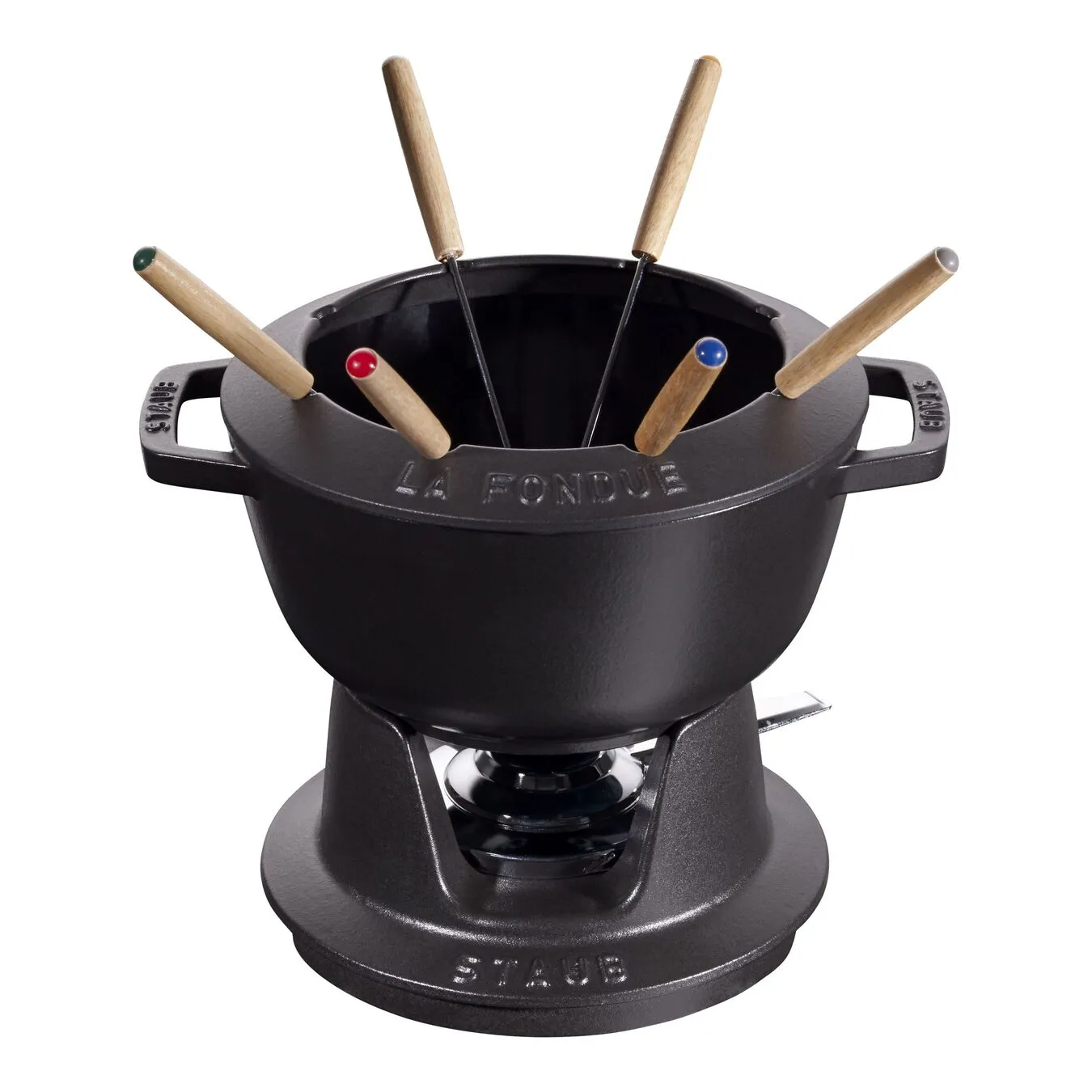 - Set composto da pentola per fonduta e supporto in ghisa, bruciatore, paraschizzi e 6 forchette da fonduta
