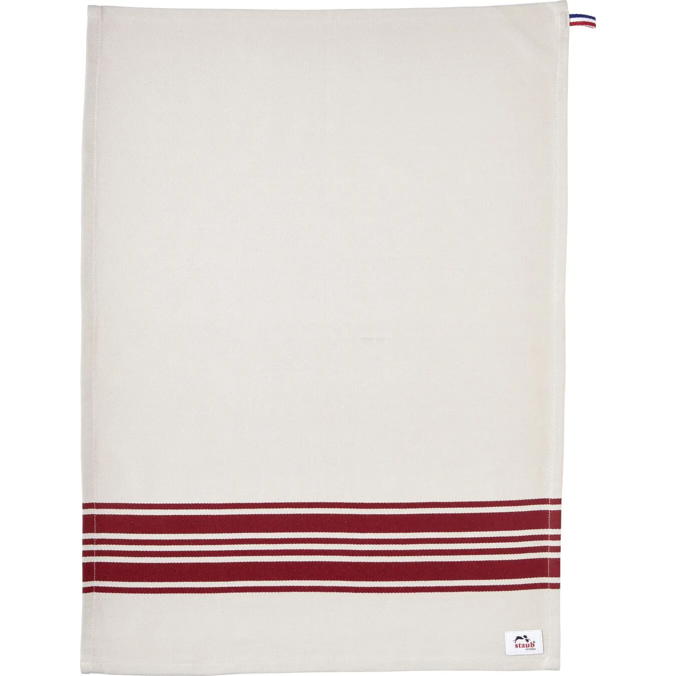 Il nuovo strofinaccio da cucina di STAUB dalle dimensioni di 50 x 70 cm è un vero ‘Allrounder’ per la tua cucina. Potrai eseguire in maniera impeccabile tutti i compiti previsti per lo strofinaccio, ma con la comprovata qualità STAUB: asciugare, pulire, lucidare… Cucinare senza uno strofinaccio è pressoché impensabile. Inoltre, questo è particolarmente assorbente, realizzato in cotone puro e studiato per una maggiore durabilità: in un angolo troviamo un pratico laccetto ricamato e gli orli su tutti e quattro i lati sono ripiegati. Degno di nota è anche il design raffinato e senza tempo. La calde righe rosso carminio formano un grazioso contrasto sulla stoffa bianco naturale e si sposano bene sia con una cucina di una casa di campagna, che con una cucina minimalista o professionale. Una discreta etichetta con il logo STAUB rivela il produttore e l’origine del design nella bandierina tricolore francese. In ogni caso, lo strofinaccio STAUB è un elemento che arricchisce ogni cucina.