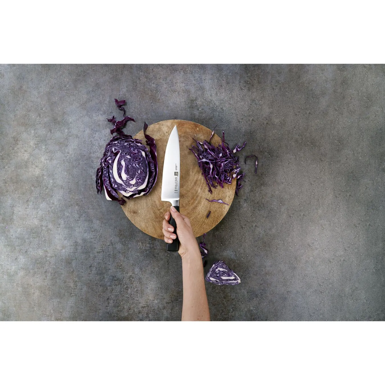 La gamma FOUR STAR® di ZWILLING è una gamma di coltelli da cucina di prima qualità. Il set da 2 pezzi include coltelli per usi diversi. Le loro lame sono realizzate in lega di acciaio speciale ZWILLING e sono sottoposte a diversi processi di tempra, inclusa quella criogenica. Ciascun coltello è prodotto da un solo pezzo di acciaio privo di fastidiose sporgenze e con una superficie continua tra nodo e manico. Il solido manico liscio in plastica è comodo da impugnare e agevola il taglio preciso e senza sforzo. Il set di coltelli da 2 pezzi include uno spelucchino, conosciuto anche come coltello da ufficio. È compatto, leggero e versatile ed è dotato di una lama slanciata da 10 cm e di una punta centrata. È ideale per pulire, sbucciare e affettare ogni giorno frutta e verdura. Lo spelucchino può essere anche utilizzato per guarnire e per preparare e spellare la carne. Il set include anche un coltello Santoku con una lama da 18 cm. La sua ampia lama e il suo filo tagliente lo rendono ideale per preparare carne e pesce ma anche frutta e verdura. Con questo set di coltelli potrete eseguire tutte le operazioni di taglio necessarie con precisione.